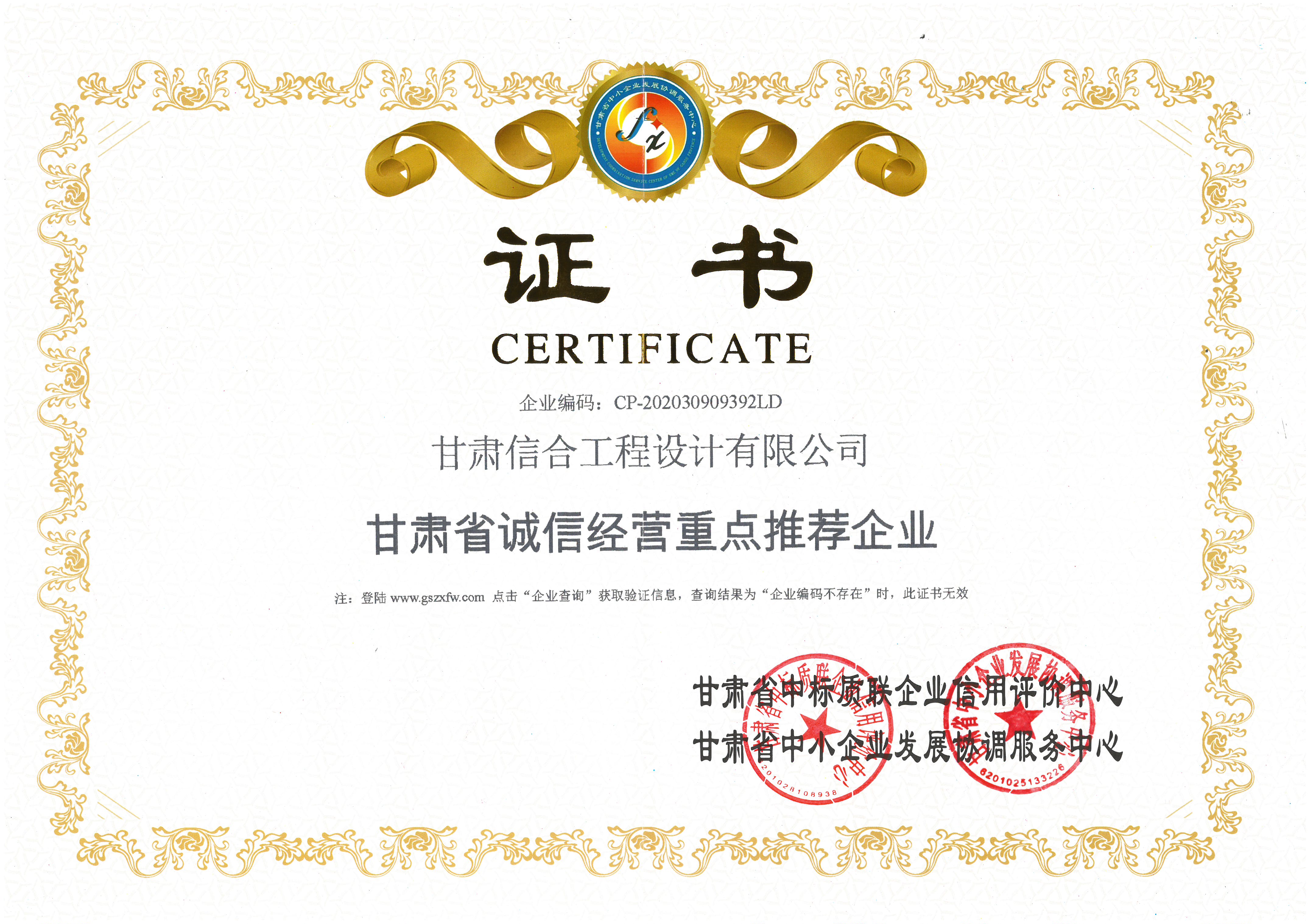 甘肅省誠信經(jīng)營重點推薦企業(yè)證書