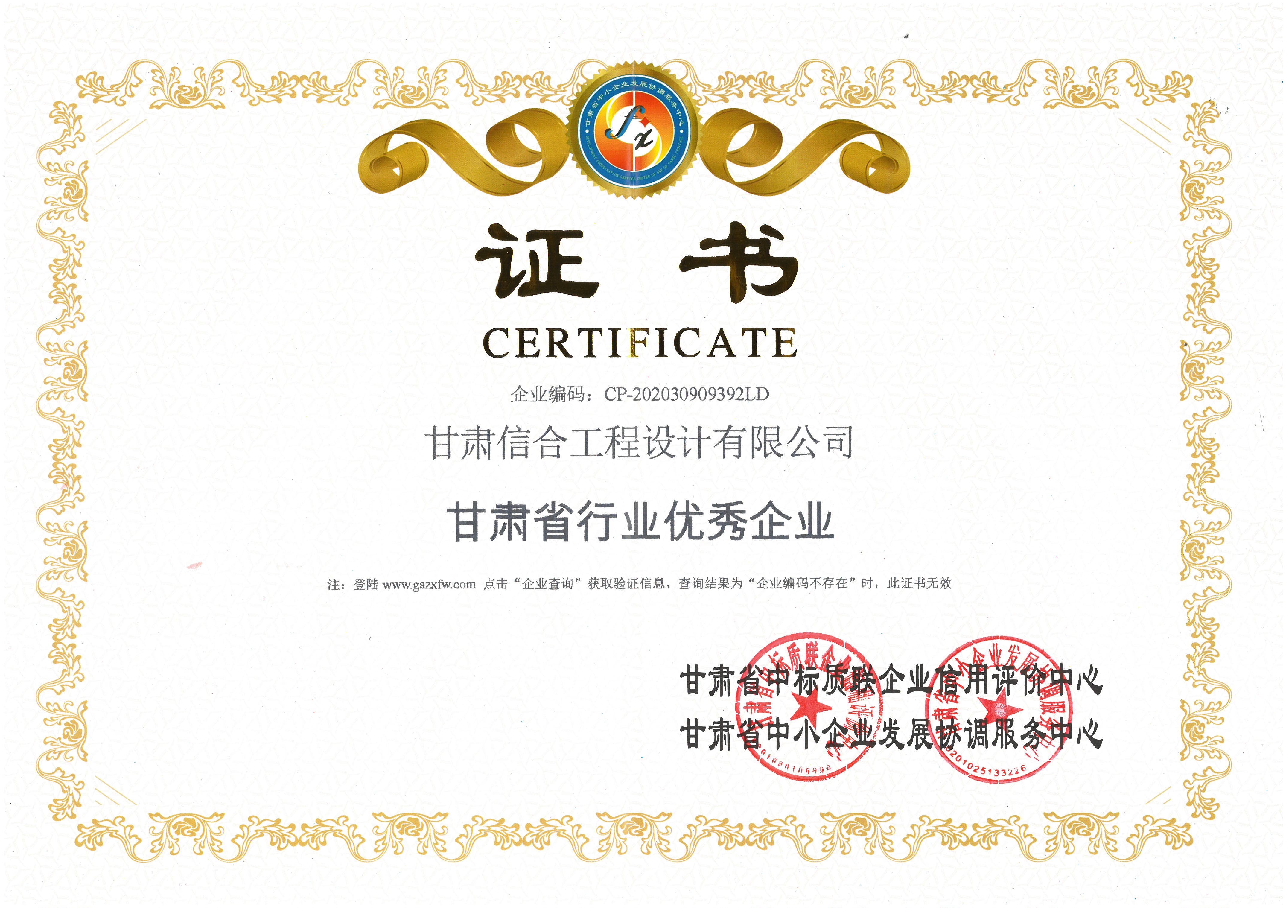 甘肅省行業(yè)優(yōu)秀企業(yè)證書